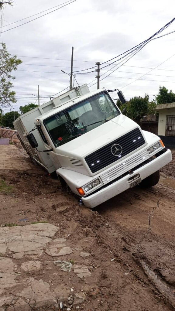 Según la vecina, el vehículo habría quedado inmovilizado al hundirse una parte del pavimento, y fue necesario retirarlo con maquinaria pesada.