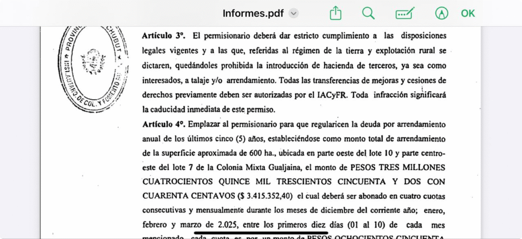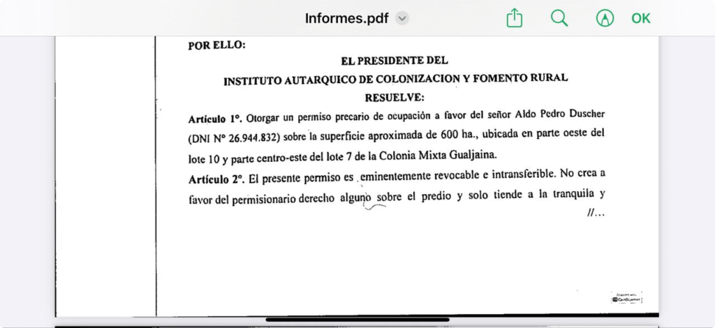 Documento de la IAC en donde se le otorga a duscher el permiso de ocupación de 600 héctareas por el irrisorio monto de 3.415.352,40 pesos.