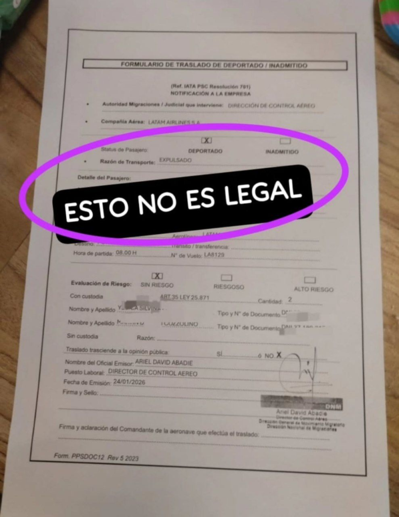 Tras arribar desde Brasil, Bicho fue rechazado en frontera bajo la figura de “falso turista”. Firmó el acta en estado de crisis, angustia y llanto, sin recibir explicaciones ni atención médica previa.