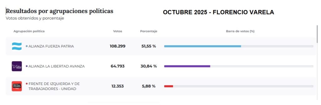 En Florencio Varela, la elección también dejó señales claras: La Libertad Avanza sumó casi 15 mil votos más que los que sumó el oficialismo peronista respecto a los comicios de septiembre. Si bien la mayoría de los sufragios locales continúan apoyando al peronismo, el crecimiento de la principal fuerza opositora resulta llamativo, especialmente considerando que coincide con el cambio de sistema de votación.
