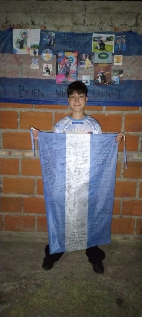 Con él también viajó una bandera argentina distinta a todas. No una comprada a último momento ni una pieza más del equipaje. Una bandera firmada por vecinos, amigos y familiares que hicieron posible este viaje, cubierta de mensajes de amor, buenos augurios y esperanzas. En esa tela quedó escrito algo más que una despedida: la prueba de que Ian no partió solo, de que cada firma fue una manera de decirle que detrás de su competencia hay una red de afectos que también cruza el océano.